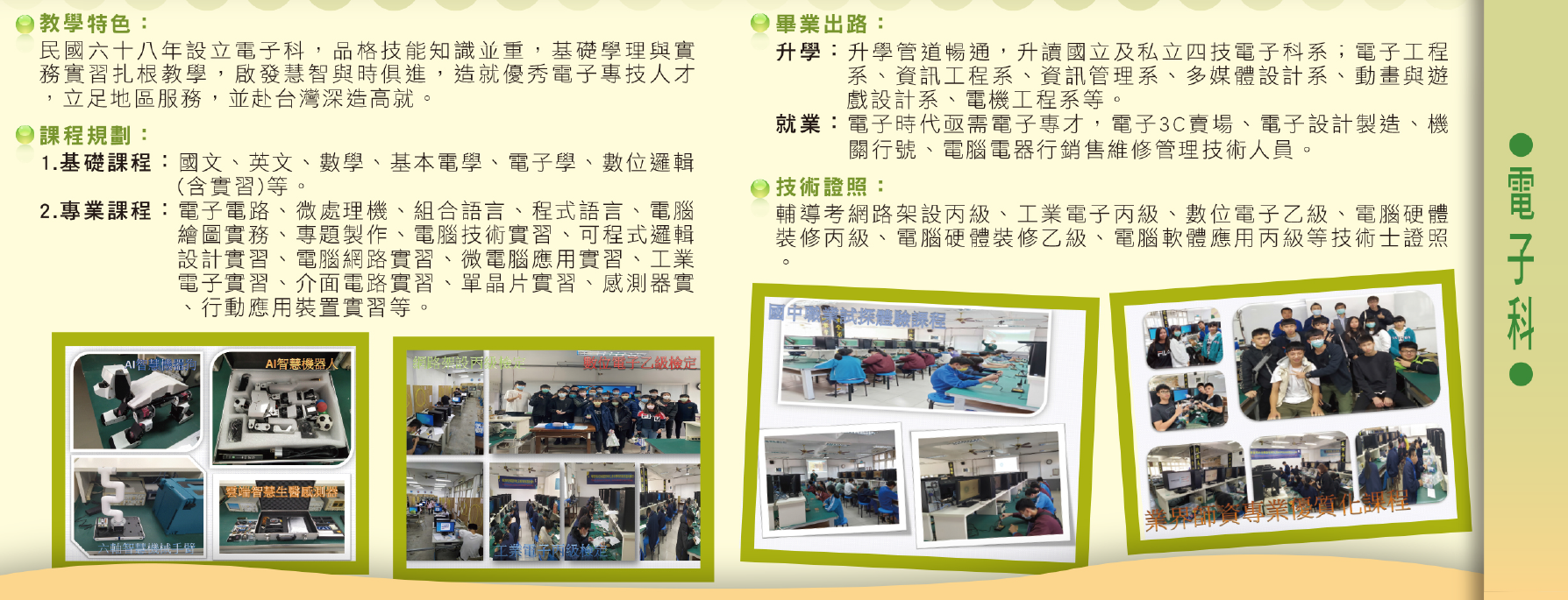 2.培育更上層之電子專業人才,鼓勵並開設升學輔導課程,以厚植其深造之實力。 |