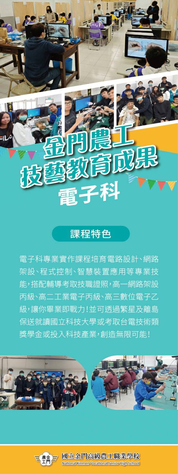 本科於民國 68 年成立。為三年制高級職業學校電子設備修護科附設於金門高中。民國 70 年奉准獨立設校 - 福建省立金門高級職業學校;民國73 年改隸教育部為國立金門高級農工職業學校至今。 |