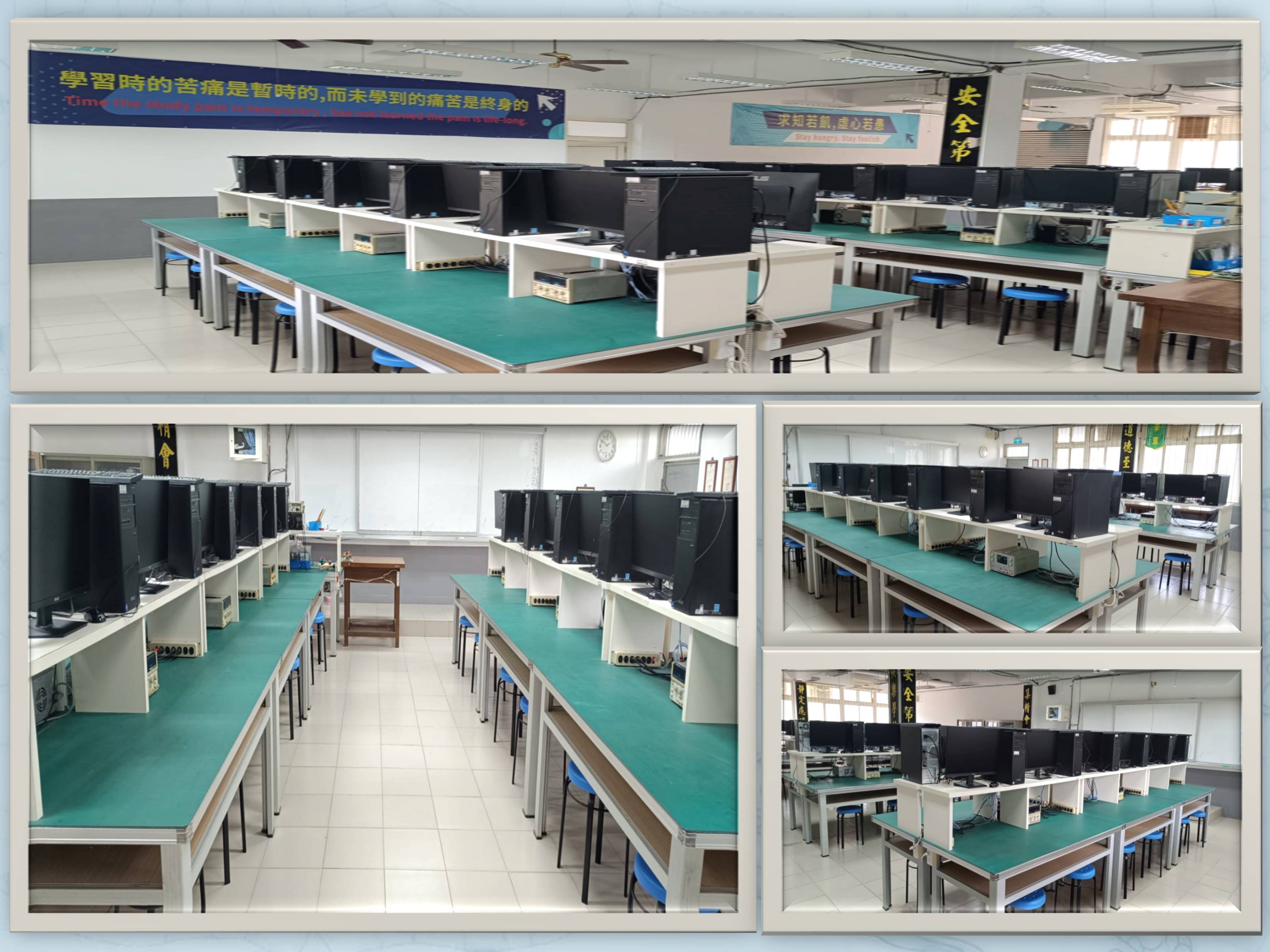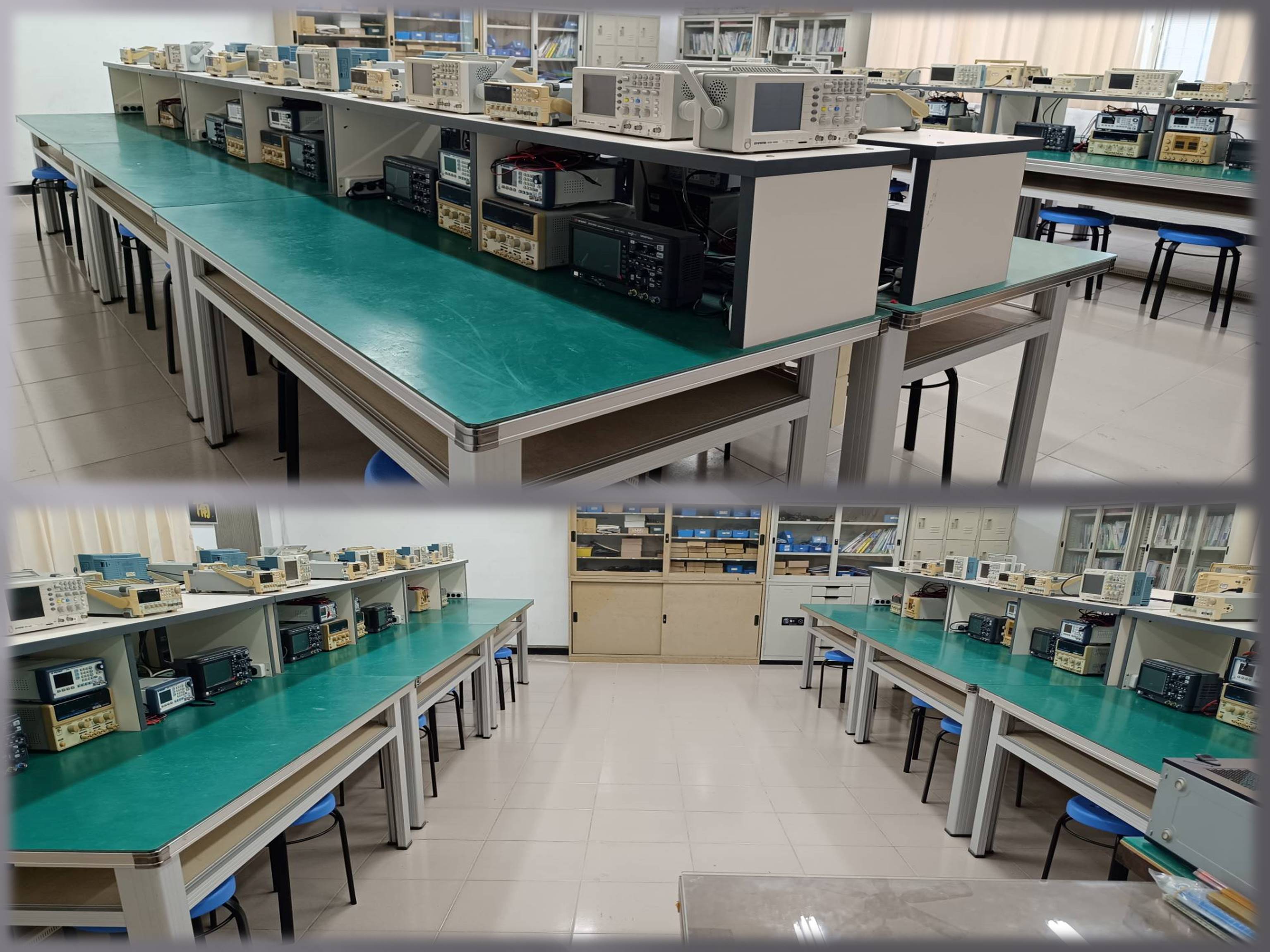 ![]() | 設備: 電子白板1套 實物投影機1台 超短焦投影機1台 個人電腦23台 雙軌示波器12台 數位示波器12台 PIC實習模擬器16套 PIC實習板16套 電腦網路 壁掛機架SWITCH HUB 1組 |